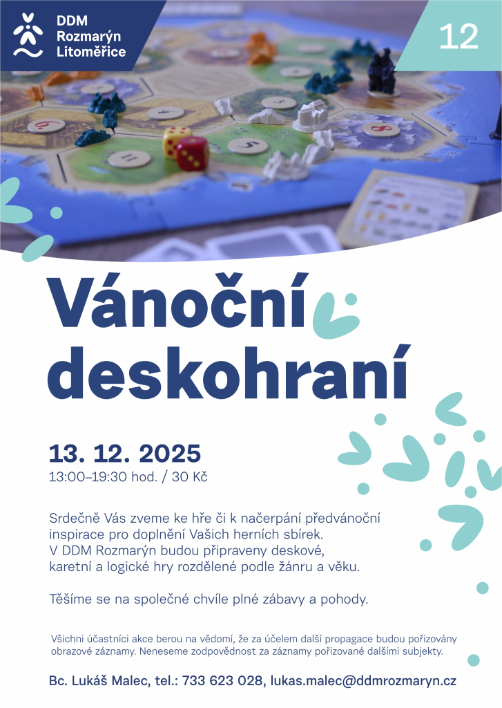 Srdečně Vás zveme ke hře či k načerpání předvánoční inspirace pro doplnění Vašich herních sbírek. V DDM Rozmarýn budou připraveny deskové, karetní a logické hry rozdělené podle žánru a věku.